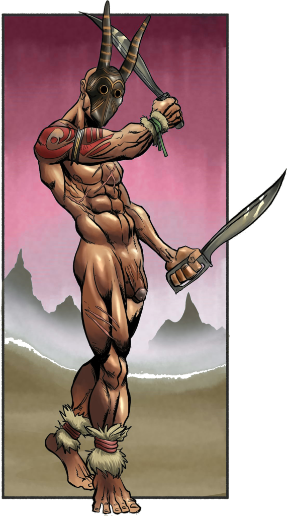 Their flesh is marked by scarification rituals that give their sinewy bodies a cruel appearance, while their teeth are sharpened as part of their coming-of-age rites. They also paint themselves with earthy pigments and are masters of ambush.
